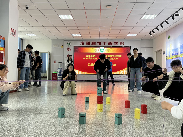 在“民族团结一家亲”活动环节,两院师生打破学科界限组建石榴籽团队,通过积木堆堆高和“八人八足”趣味游戏构筑团队协作,深化“水利人的坚韧”与“体育人的拼搏”精神共鸣。体育学院鲁勇老师还带领大家一起学习了健身气功“八段锦”,在舒缓节奏中感悟传统文化蕴藏的修身智慧。让我们学会在工作中调节身心,注重健康,强健体魄。