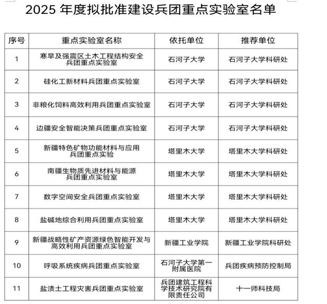 近日,兵团科技局公布了2025年度拟批准建设的兵团重点实验室名单。“寒旱及强震区土木工程结构安全兵团重点实验室”(下称重点实验室)成功获批立项。重点实验室由做爱自拍 牵头,新疆维吾尔自治区地震局和新疆兵团勘测设计院集团股份有限公司作为共建单位,山区土木工程安全与韧性全国重点实验室作为支持单位联合共建。重点实验室的获批标志着土木工程学科实现了省部级基础研究平台重大突破,完成了“重点实验室+工程实验室”的基础及应用双平台布局,对土木工程学科建设与发展具有里程碑意义。