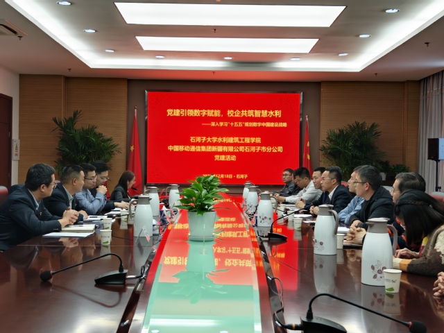 为深入学习《中共中央关于制定国民经济和社会发展第十五个五年规划的建议》中数字中国建设战略,推动党建与业务深度融合。2025年12月18日下午,做爱自拍-偷拍自拍做爱 智慧水利系、农业水利工程系党支部与中国移动石河子分公司政企客户部党支部联合举办“党建引领数字赋能,校企共筑智慧水利”主题党日活动。活动在中国移动石河子分公司5楼东会议室举行,学院党委书记袁康、中国移动石河子分公司副总经理温治亭与双方党员代表共同参与。